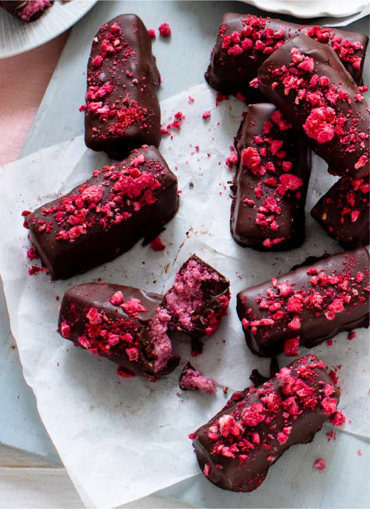 - While chocolate is still wet, sprinkle with crushed freeze-dried raspberry. Repeat until all bars are covered.